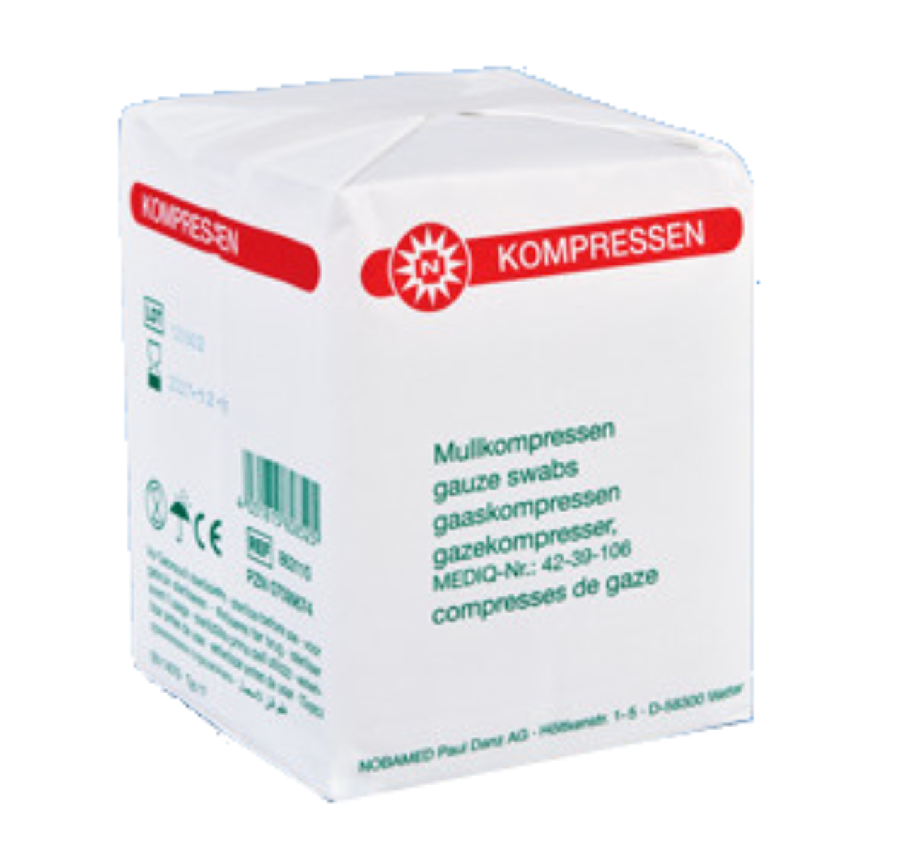 Die unsterile Mullkompresse mit eingeschlagener Schnittkante wird aus Verbandmull gefertigt nach den Vorgaben aus: EN 14079 Typ 17. Sie sind in einem sterilisierbaren Papierbeutel abgepackt. Die Kompressen müssen vor ihrer Verwendung auf offenen Wunden mit einem validierten Verfahren sterilisiert werden.